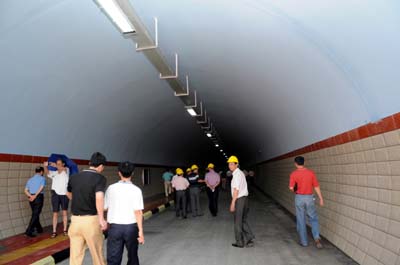记者实地走一趟花了约20分钟。隧道内安装了4台功率11千瓦的鼓风机,可保空气通畅,洞壁上新添的7个扩音器,作今后管理中心喊话用,一旦洞内发生事情,管理中心人员就可以直接喊话提醒。手机和小灵通在隧道内均有信号,与外界联系没问题。