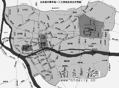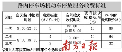 市物价局昨日公布,路内停车场按现行公共露天停车场地区划分办法,划分为三类地区。上下九步行街、北京路步行街以及天河城周边路段列入一类地区,每天8:00至22:00收费标准为5元/半小时;其余的二、三类地区8:00至19:00时段,标准分别为4元/半小时、2元/半小时。