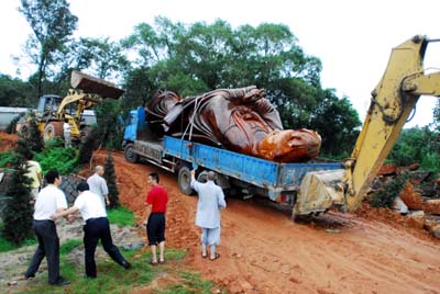 昨日上午10点多,吊车和拖车到位后,雕像便开始被送往山顶观音阁的位置。但由于雕像太重,拖车在半山腰被卡住,加上昨日中午的一阵大雨,拖车卡在泥泞的道路中无法前行。后来,又调来两辆铲车,前后推拉,雕像在下午4点多送上了观音阁施工处。