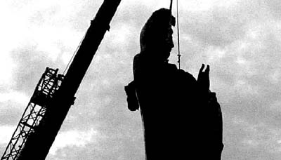 ▲▲昨晚7时38分,上边吊车吊,下边人力拉,观音像终于完美落座