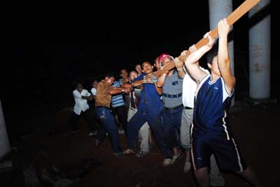 为了避免在组装中产生位置偏移,佛像脚底使用了三个楔子,必须正确插入底座上对应的三个凹槽,才能使接合处紧密。但由于佛像太高太重,吊起来后发生倾斜,用了很多方法都无法使楔子正确对位。最后,在佛像底部绑上绳,由十几个人在下面拉,四个人在底座上调整,到了19点38分,整座观音像才完全组装完。