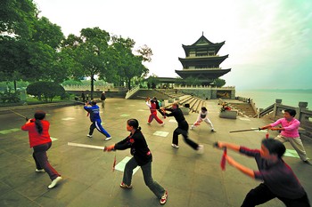 市民在湘江风光带杜甫江阁旁舞剑健身。乔育平 摄