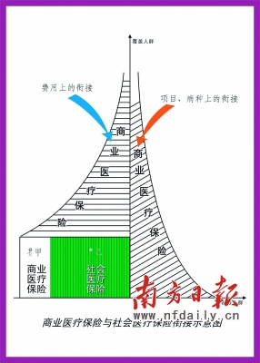 平安人寿深圳分公司后援部总经理马建萍曾经致力于商业医疗保险和社会医疗保险的衔接性研究,她表示,面对少儿医保低水平的现状,儿童商业医疗保险的市场空间仍然巨大。她向记者展示了一个商业保险与社会保险衔接示意图(见左图)。