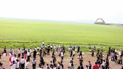 □栈桥海水浴场的绿藻就像一条“绿地毯”铺在海面上 晨报记者 李晓明 现场图片 □晨报记者 李晓明 青岛报道