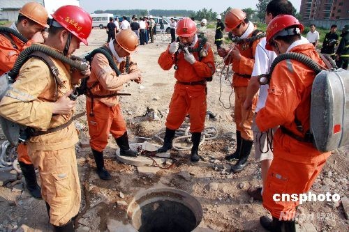 6月29日14时48分,安徽省淮北市公安局接到报警,在该市南黎路中段南侧、原惠丰公司院内,清淤人员在污水窨井内清淤时,由于窨内存有有害气体,造成7人窒息死亡。中新社发 万善朝 摄