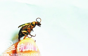 本报杭州讯 昨天上午,在杭州拱墅区方家塘上班的程家华先生独自在办公室,他的右手指头被一昆虫“烫”了一下,又痛又麻,手指表面黑乎乎的,感觉还有淤血。