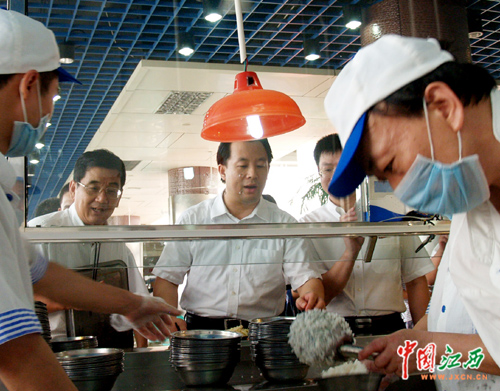 7月3日中午,团中央书记处第一书记陆昊来到南昌大学第二食堂用餐,图为陆昊在打饭。(江西网记者 沈德森 摄)