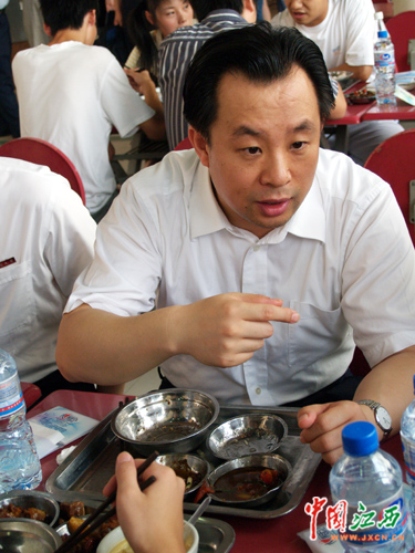 陆昊打好饭菜后,在食堂右边找了个空位坐下。随后陆昊便与正在就餐的同学们边吃边攀谈起来。坐在对面的邢祥同学对陆昊的到来有点惊讶。她“冒昧”地打量了陆昊这位年轻的高官,随后与陆昊有点忐忑地交流起来,邢祥告诉陆昊,她来自山东,是南昌大学新闻系07级学生,目前在学校一切都已习惯。