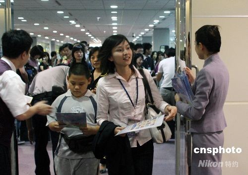 7月4日晨七时三十分,台湾中华航空公司兰花彩绘的CI-7957班机搭载着三百多位乘客自台北桃园机场飞往上海。这是两岸周末包机启动后台湾起飞的首班包机。图为乘客在登记时获赠“两岸周末包机纪念邮票”。中新社发 黄少华 摄