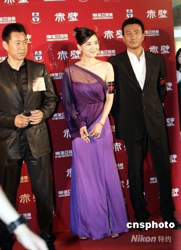 资料图:集内地与港台多位名星打造的电影《赤壁》,三十日晚在香港举办慈善首映礼。内地实力派演员张丰毅(左)、胡军及长相甜美的宋佳出席活动。中新社发 王丽南 摄