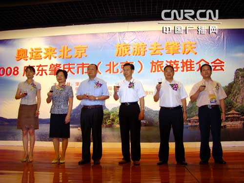 中广网北京7月7日消息(记者冯赣勇)以“奥运来北京 旅游去肇庆”为主题的“2008广东肇庆市(北京)旅游推介会”今天在北京隆重举行。来自首都部分新闻媒体记者及两百多家北京旅行社的负责人应邀出席。