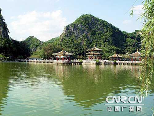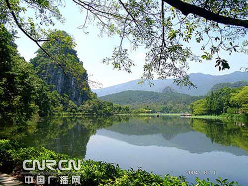 广东肇庆星湖风景区主要由七星岩与鼎湖山组成。七星岩原是由西江古河道形成的沥湖,主体由阆风岩、玉屏岩、石室岩、天柱岩、蟾蜍岩、仙掌岩、阿坡岩七座石灰岩山峰组成,排列如北斗七星般撒落在碧波如镜的近600公顷湖面上,20多公里长的林荫湖堤,如绿色带飘般把仙女湖、中心湖、波海湖、青莲湖和里湖连结在一起,湖光山色,绰约多姿。