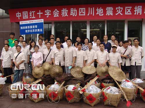 据介绍,本次活动有来自全国的上千名志愿者积极报名要求参加,最终入选的20名义工来自安徽等六省区,他们中有新徽商、教师、军人、作家、大学生和媒体工作者,年龄最大的61岁,最小的22岁。从6月12日至今,他们从安徽池州市石台县古徽道出发,一路重走当年徽茶进京的路线,把历史名茶徒步挑进了北京,挑到了中国红十字会总会,献上一份对四川灾区受灾同胞的爱心,同时也表达他们对成功举办奥运会的祝福。