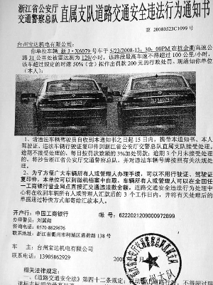如图,台州某机电公司老李昨天收到了这么一份交通违法通知书,说今年5月23日他的车子在杭金衢高速公路被雷达测速为时速129公里,该路段限速100公里/小时,超速了50%,得罚款200元,要他把罚款打到下面这个交警的银行账号就好了。
