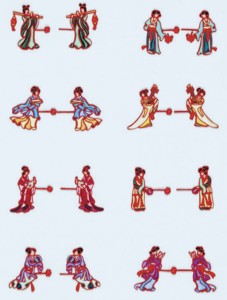 掌握了传统图案后,珊丽娜又想在此基础上创新设计新盘扣。她寻觅、征集了大量新图案,于传统中融入时代气息。如“百鸟朝凤”、“龙凤呈祥”、“寿字盘扣”、“蝴蝶盘扣”等。