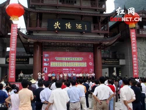 红网张家界7月9日讯(通讯员 邓道理 胡少丛 朱明先)水墨张家界,相伴奥运行。7月9日,《2008张家界山水览胜图》捐赠奥运会组委会巡展启动仪式在世界自然遗产武陵源隆重举行,张家界市人民政府、武陵源区人民政府主要领导及当地干部群众、海内外游客近千人参加了启动仪式,并参观了《2008张家界山水览胜图》展览。据了解,《2008张家界山水览胜图》为目前绘画张家界山水题材的长卷之首。