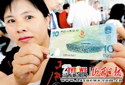 7月9日,第29届奥林匹克运动会纪念钞在省城与市民见面。在中国银行山西省分行门前,兑换纪念钞的市民排起了长龙,仅一个多小时,1000张纪念钞兑换一空,许多排队的市民空手而归。此次发行的奥运纪念钞面额为10元,市民可拿等值人民币兑换,每人限兑换一张。
