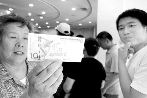 昨日13时30分,第29届奥林匹克运动会纪念钞开始在我省发行。面额为10元,市民可凭身份证以等值人民币兑换,每人限兑换一张,每家商业银行只能有一个网点发行。由于银行布局的原因,中国农业银行河南省分行营业部就成了郑州西区惟一的兑换网点,兑换的队伍从营业大厅一直排到了大街的人行道上。