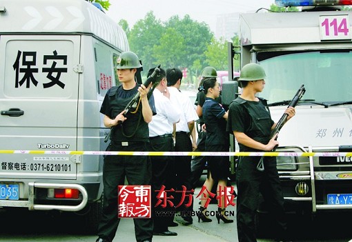 几名保安立即从运钞车上下来,拉起警戒线将运钞车围起来。一些路人好奇地想凑过去看,但看到车两侧手持枪支的保安,只能望而却步。几分钟后,另一辆运钞车赶来,迅速将“出事”运钞车上的钱款转移走(如图)。