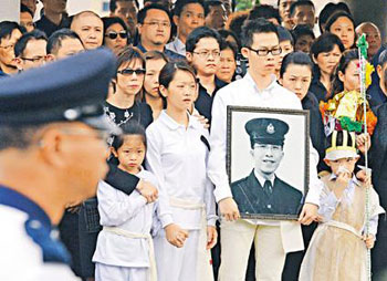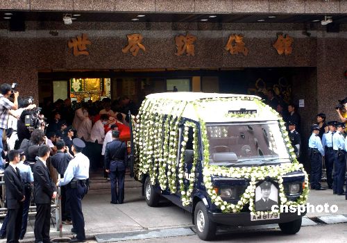 资料图:香港尖沙咀枪击案殉职警员曾国恒,以警队最高规格举行丧礼,仪式于世界殡仪馆举行,由曾国恒生前的同袍扶灵。中新社发 谭达明 摄