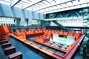 沿着石阶,从二层大门走到馆里,一下子被眼前的景象深深吸引。馆内阅览区分为中厅和外环两大部分。中厅里,看不到冷冰冰的墙壁和书架,四周是已经摆满图书的书墙,围抱着一个洒满阳光的巨大天井,仿佛一个城市的客厅,温馨、舒适又气派。