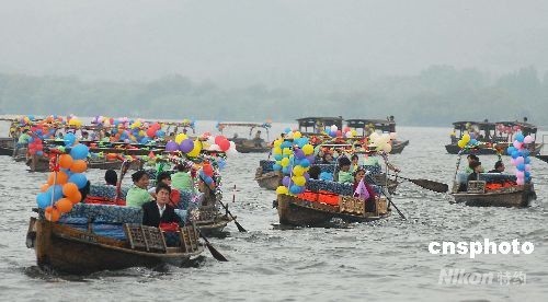 第二届“西湖船会”于4月8日在浙江杭州西湖登场。本届西湖船会有百余艘各类西湖船只亮相,重点挖掘和再现杭州悠久而丰富的历史文化,展现当今杭州的社会生活风貌。船会将彩船巡游、自划船比赛、运动船只竞技和表演有机结合,融参与性、文化性和观赏性于一体。 中新社发 引炜 摄