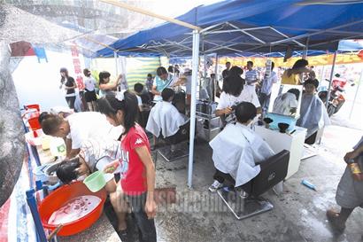 7月11日上午,记者来到绵竹市中心广场看到,广场临街边一排帐篷里,几名年轻的美发师正在为客人理发。尽管帐篷里炎热无比,但六个理发座位全都坐着正在理发的客人,帐篷外还有几个等待理发的客人。理发师小马告诉记者,老板刘德荣联系铺面去了。经过电话联系,10多分钟后,刘德荣来到帐篷里接受了记者的采访。