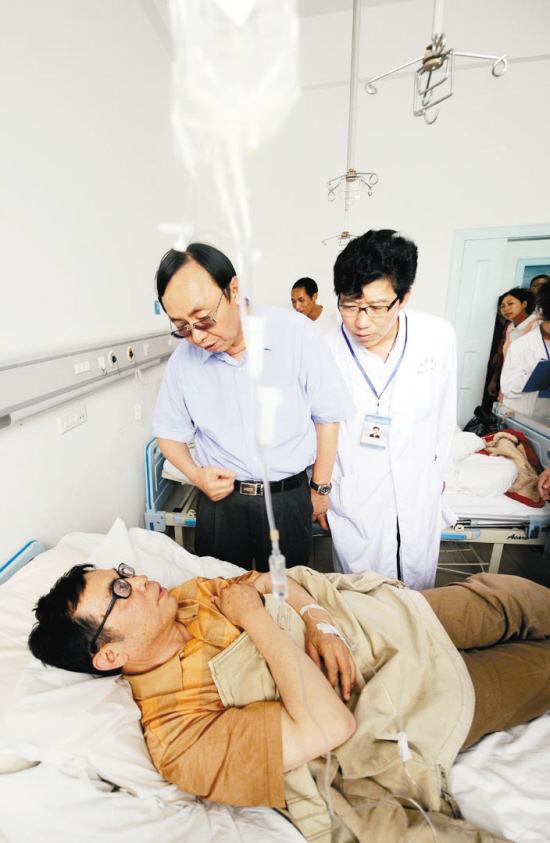 一位受伤者(下)在昆明医学院第一附属医院与医生及探视者交谈。新华社记者邹峥摄