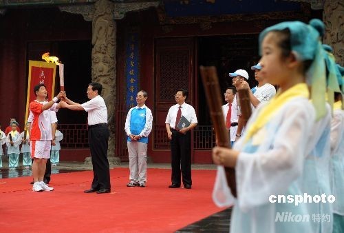 7月22日,奥运火炬在孔子故里山东曲阜传递,孔子74代孙孔鹏在曲阜孔庙大成殿朗朗论语读书声中传递首棒奥运火炬。中新社发 廖攀 摄