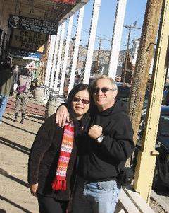 聂崇彬与洋丈夫在内华达州的历史小镇Virginia City采访时留影。(聂崇彬 提供)