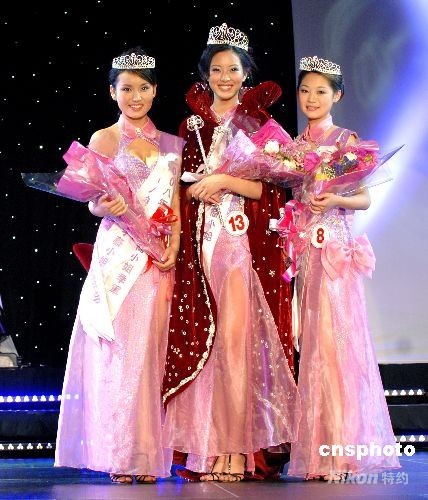 2008年纽约华裔小姐竞选决赛于7月20日凌晨举行,出生纽约的18岁佳丽彭瑞霖(中)夺得冠军;出生于中国大连,今年3月移民美国的18岁的杨茜(右)获亚军;获得第三名的是出生云南的19岁白族姑娘杨晓(左)。中新社发 龚文谟 摄