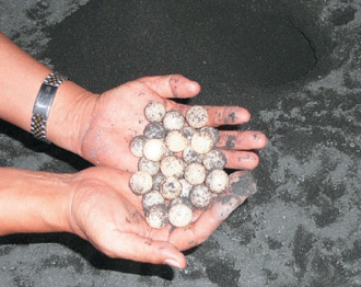 养殖池内的母鳖进到产房后,会在沙堆挖坑生蛋,这小小的鳖蛋,曾创下一颗八十九元的天价。(图片来源:台湾《联合报》)