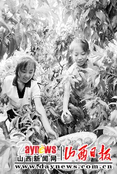 7月19日,吕梁市离石区信义镇永红村,两位小朋友正在采摘油桃。近年来,该村大力发展经济林,全村拥有核桃树、杏树、油桃树等为主的经济林800余亩,人均面积达2亩,亩产人均年收入实现3000元。