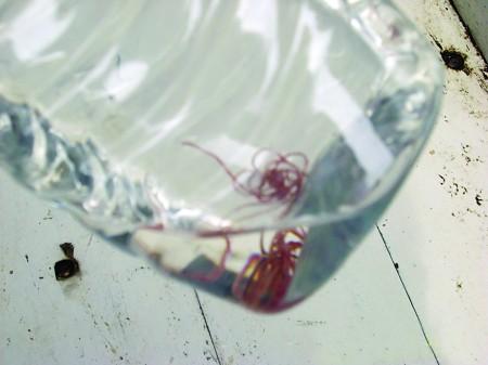 23日中午,记者在位于槐荫区二河里的李先生家看到,半桶水里游动着大大小小十多条像蚯蚓一样的虫子(如图)。最长的近5厘米,如细铁丝般粗细;红色的虫子还会聚集在一起,缩成一团。