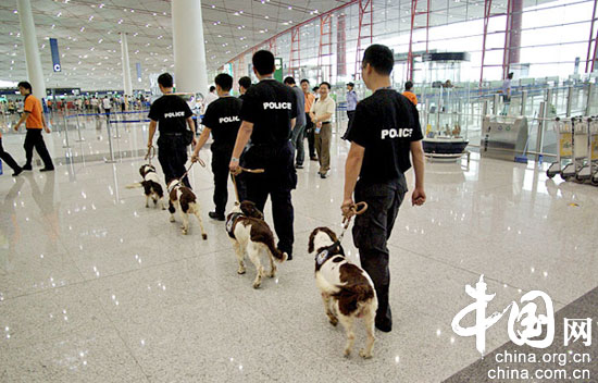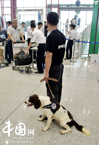 为加强奥运期间的反恐防爆工作,首都机场自7月20日起实行特别安检措施。23日在3号航站楼看到,警犬在特检人员的带领下上岗执勤。