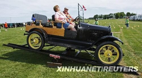 7月22日,一对来自加拿大的夫妇驾驶一辆1916产老式福特汽车在美国印第安纳州里士满参加福特“T”型车100周年活动。从7月21日开始,来自美国以及加拿大的一千多名福特“T”型车爱好者驾车来到里士满参加为期一周的老式福特汽车大聚会。