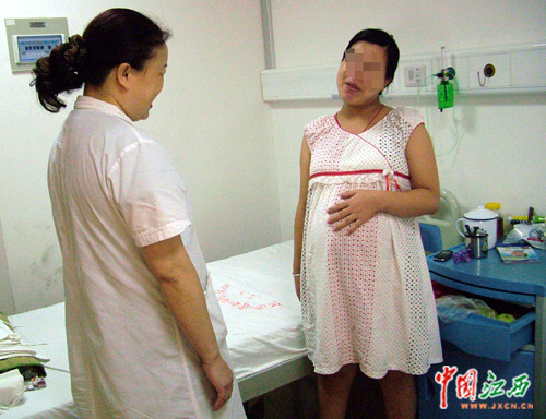 快当妈妈的刘女士乐呵呵祝愿“奥运宝宝”到来平安。(江西新闻网记者 邓小勇 摄)