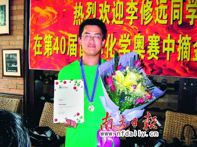 本报讯(记者/谢苗枫通讯员/区竞志)“能拿到这面金牌,我觉得是幸运的因数比较多。”昨日中午,华师附中应届毕业生李修远从匈牙利举行的奥林匹克化学竞赛夺金返穗,这是近5年来广东省在“奥化”中夺得的唯一一枚金牌。面对这样的殊荣,这位心智比同龄人明显要成熟的大男孩反认为自己最幸运的事是“考进了华附”,让他接触到一个宽广的世界。