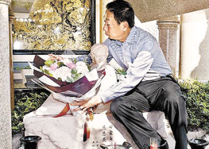 郭台铭7月25日下午4时进入墓园后,郭台铭神情肃穆,开始打理祭拜亡妻的仪式。他将一大束鲜花小心翼翼地放在爱妻雕像边,并在墓前摆上爱妻生前爱吃的四季豆干面和凉拌小黄瓜。