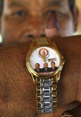 一名人民党支持者展示有洪森头像的手表和投票后墨水涂过的手指。新华/路透 图