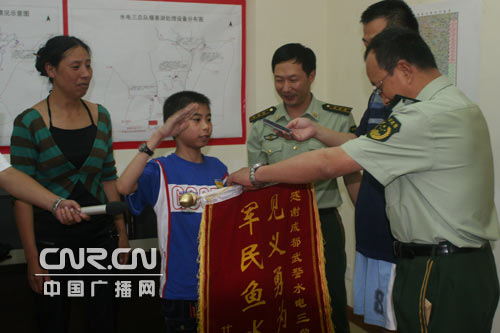 张敏的妈妈告诉记者:张敏从小就是一个非常懂得感恩的孩子,一回到四川,他就给妈妈说,要立即去找到救他的武警叔叔,向他们表示感谢,长大以后也要参军,做一个人民的子弟兵,服务人民、报效祖国。就这样,7月22日上午,张敏和妈妈通过什邡市抗震救灾指挥部一步步询问,终于到了当时在湔底中学救援的武警水电三总队机关,圆了张敏向武警叔叔谢恩的心愿。见到救命恩人,小张敏的妈妈泪流满面,一下子跪倒在亲人的面前。大家拥抱在一起,回忆起当时的救援场景,一个个泪流满面。