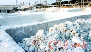 石灰厂的十余个石灰坑大部分都装满了准备运走的石灰。据周围群众介绍,这个石灰厂已经开办了数年,一般每天下午5时左右开始作业,拉石灰的车一般下午4时左右就会在石灰厂门口等了。“一直弄到深更半夜,很吵。”