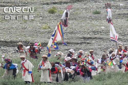 中广网拉萨7月30日消息(记者罗布次仁)随着秋季的日益临近,拉萨各地的农民步入林卡,欢度开镰收割前的“望果节”,喜迎丰收之年。 “望果”是藏语译音,意为“绕田间地头转圈”,在每年的藏历七、八月间举行。其过节方式为喇嘛在田间地头诵经祈福,各乡各村的农民拜祭山神、水神等宗教仪式开始,随后由老农组成的仪仗队高举佛像,背着经书,吹着佛号,手持麦穗围着农田转圈,感谢上天给人们带来风调雨顺的好年成。“望果节”是藏族农民欢庆丰收的传统节日,已有1500多年的历史,在西藏拉萨、山南、日喀则地区较为流行。