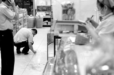 警方正在糕点区域设置警戒线,摄像取证并征集目击者配合调查。隔着警戒线,可以看到欧仕麦西饼柜台前地面上的血迹最多,或许是因为事发时顾客争相躲避,这里的血迹已被踩踏得非常凌乱。