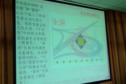 新版驾照与老驾照相比防伪图案增多均可变色,观察平安结中间的“正方形”和“菱形”颜色辨真伪。以水平轴上下转到驾驶证到45度位置,观察驾驶证的光线反射,“平安结”中间的方形图案的颜色为黄绿色(橙绿色)、“菱形反射光的颜色为蓝绿色”;当证件旋转90度后,“平安结”图案中间“正方形”转换成为蓝绿色,“菱形”变成为黄绿色(橙绿色)。与第二代身份证一样,新版驾驶证塑封膜上有5个长城组合图案,在荧光灯照射下文字为红色,长城图案为绿色。