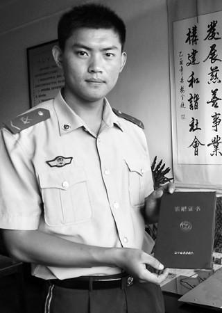 武警济宁支队的士官彭连龙展示捐赠证书。