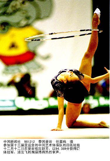 参加第十三届亚运会的中国艺术体操队的四名姑娘十二月十二日在曼谷技压群芳,以94.389分获得团体冠军,浦云飞的圈操博得热烈掌声。中新社发 任晨鸣 摄