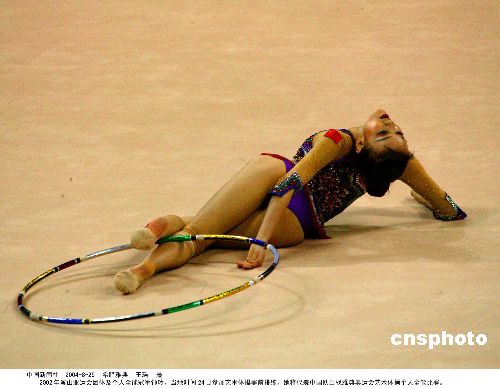 2002年釜山亚运会团体及个人全能冠军钟玲,当地时间24日参加艺术体操赛前排练,她将代表中国队出战雅典奥运会艺术体操个人全能比赛。中新社发 王瑶 摄