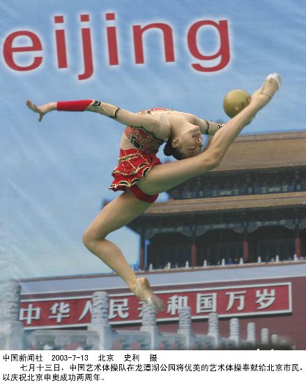 七月十三日,中国艺术体操队在龙潭湖公园将优美的艺术体操奉献给北京市民,以庆祝北京申奥成功两周年。中新社发 史利 摄
