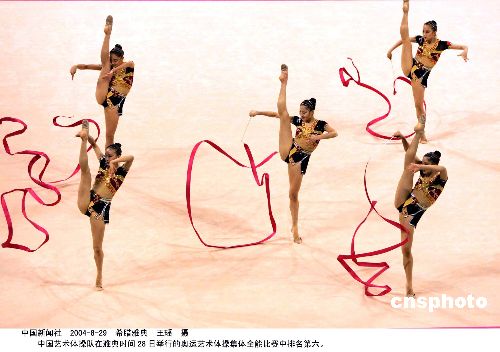 中国艺术体操队在雅典时间28日举行的奥运艺术体操集体全能比赛中排名第六。中新社发 王瑶 摄